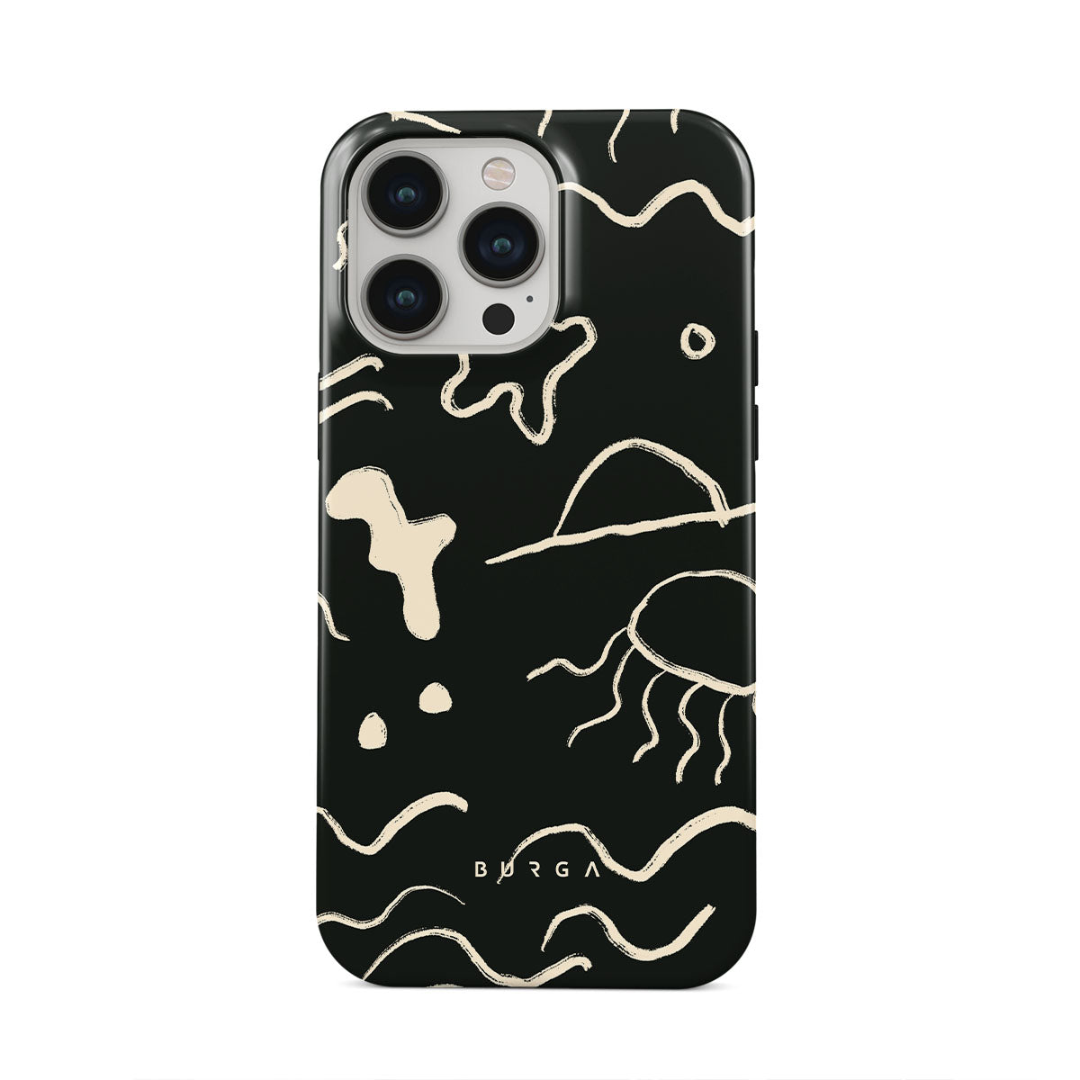 Our Eclipse iPhone 14 Pro design reflects the enigmatic beauty of the ocean during a solar eclipse. The dark hues and bright accents represent how the light dances on the water, while the waves and jellyfish capture the serene yet dynamic nature of the ocean.
