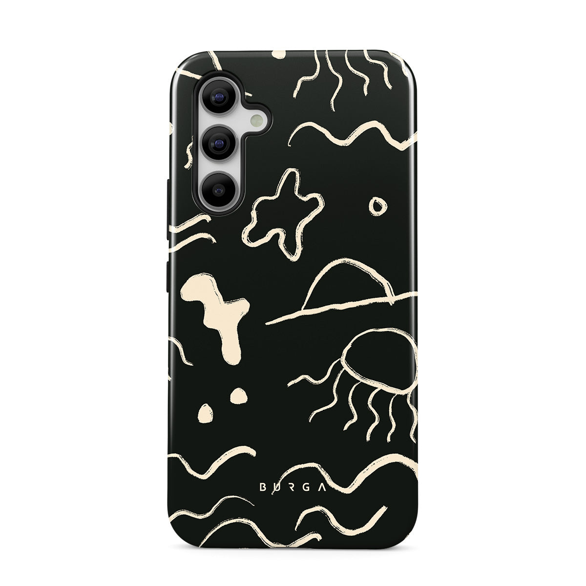 Our Eclipse Samsung Galaxy A55 design reflects the enigmatic beauty of the ocean during a solar eclipse. The dark hues and bright accents represent how the light dances on the water, while the waves and jellyfish capture the serene yet dynamic nature of the ocean.
