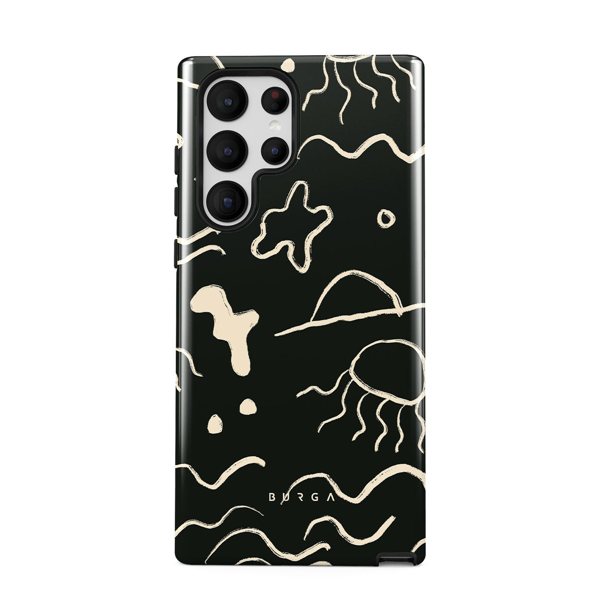 Our Eclipse Samsung Galaxy S22 Ultra design reflects the enigmatic beauty of the ocean during a solar eclipse. The dark hues and bright accents represent how the light dances on the water, while the waves and jellyfish capture the serene yet dynamic nature of the ocean.