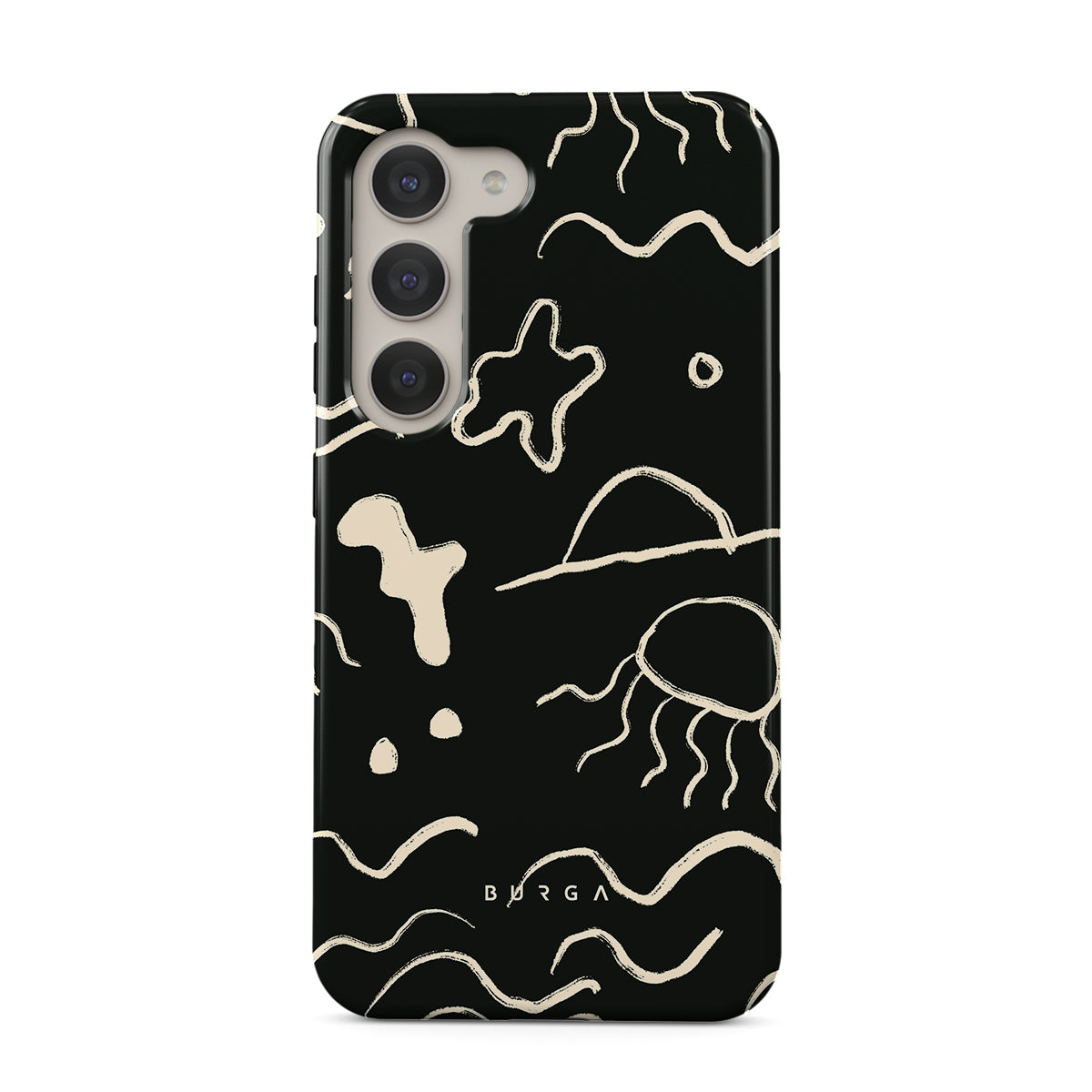 Our Eclipse Samsung Galaxy S23 design reflects the enigmatic beauty of the ocean during a solar eclipse. The dark hues and bright accents represent how the light dances on the water, while the waves and jellyfish capture the serene yet dynamic nature of the ocean.