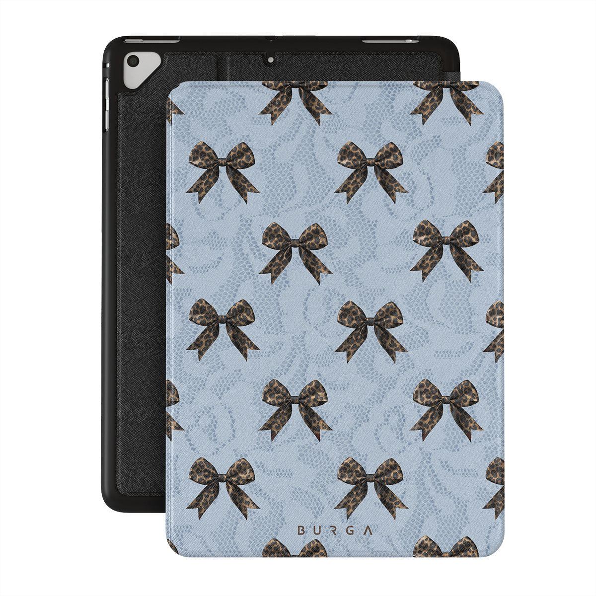 For those who command attention with subtle elegance, our Fashionista iPad 9.7 (6th/5th Gen) folio case design is your go-to. A soft blue background, accented by dark grey bows and subtle lace patterns, exudes polished, effortless style. It's quiet confidence with a hint of charm.
