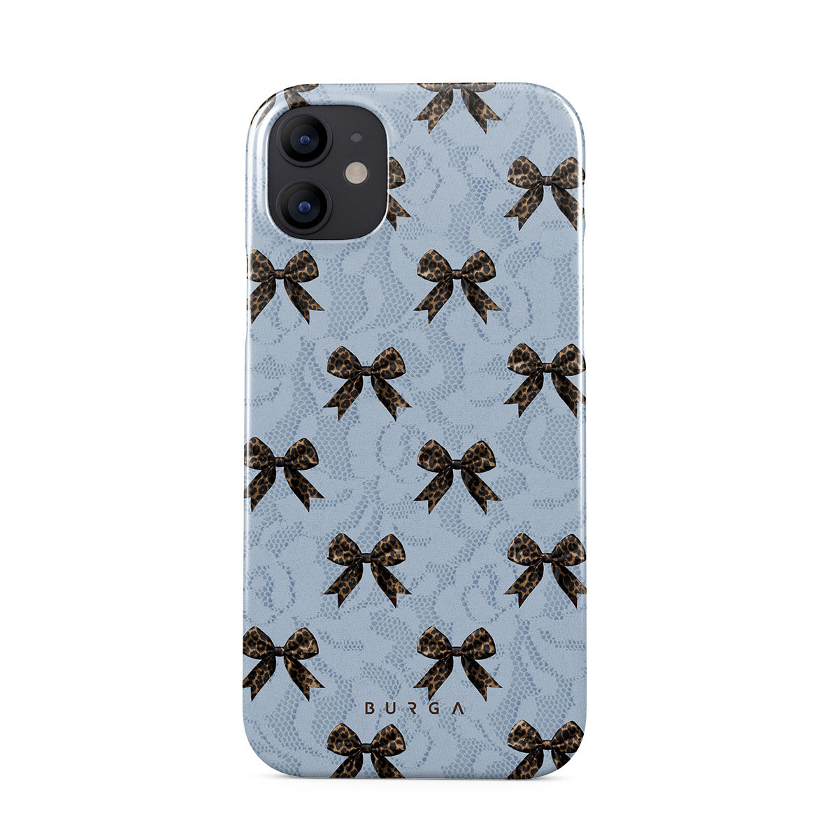 For those who command attention with subtle elegance, our Fashionista iPhone 12 Mini phone case design is your go-to. A soft blue background, accented by dark grey bows and subtle lace patterns, exudes polished, effortless style. It's quiet confidence with a hint of charm.