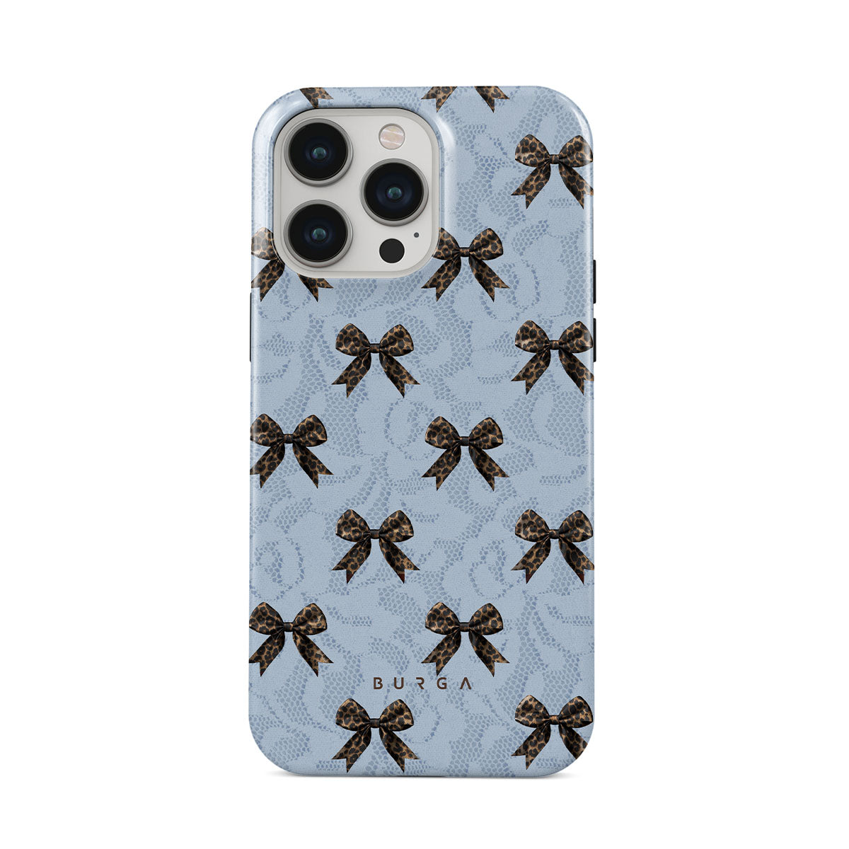 For those who command attention with subtle elegance, our Fashionista iPhone 13 Pro phone case design is your go-to. A soft blue background, accented by dark grey bows and subtle lace patterns, exudes polished, effortless style. It's quiet confidence with a hint of charm.