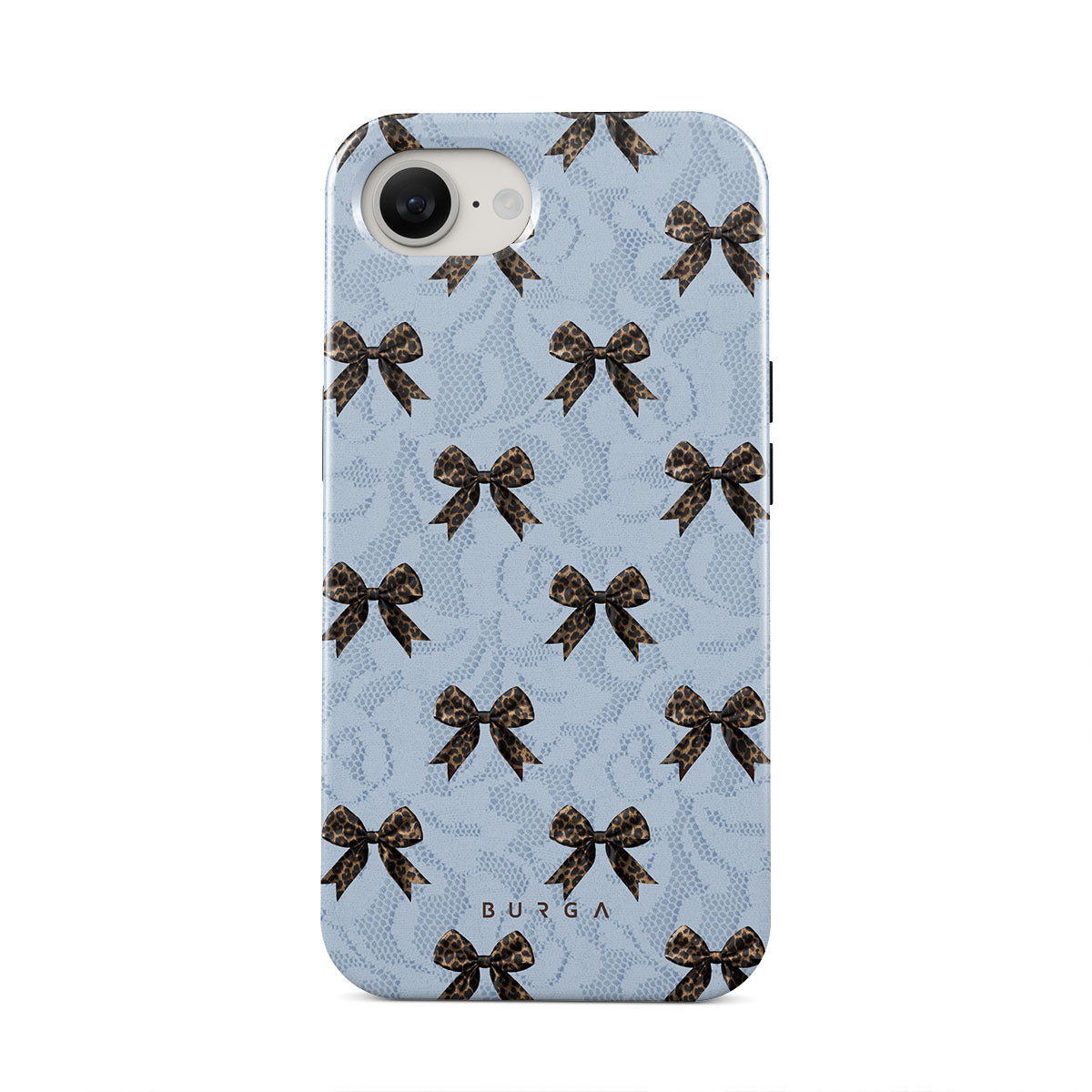 For those who command attention with subtle elegance, our Fashionista iPhone 16e phone case design is your go-to. A soft blue background, accented by dark grey bows and subtle lace patterns, exudes polished, effortless style. It's quiet confidence with a hint of charm.