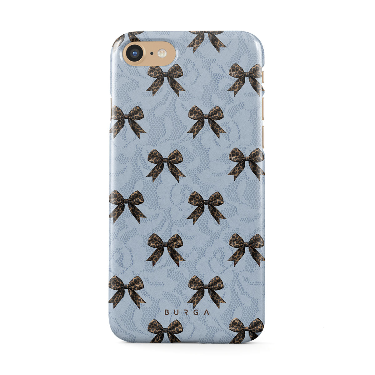 For those who command attention with subtle elegance, our Fashionista iPhone SE (2020) phone case design is your go-to. A soft blue background, accented by dark grey bows and subtle lace patterns, exudes polished, effortless style. It's quiet confidence with a hint of charm.
