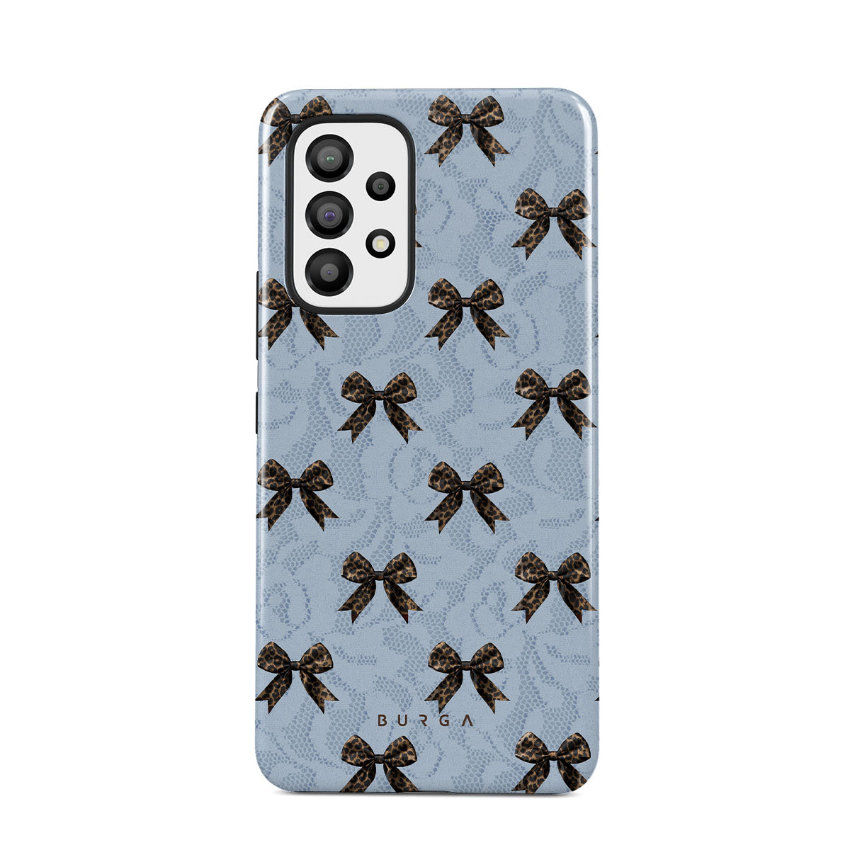 For those who command attention with subtle elegance, our Fashionista Samsung Galaxy A53 phone case design is your go-to. A soft blue background, accented by dark grey bows and subtle lace patterns, exudes polished, effortless style. It's quiet confidence with a hint of charm.