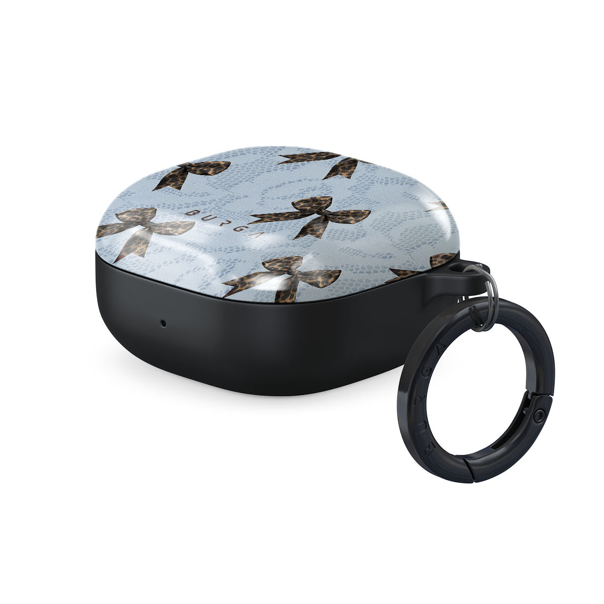 For those who command attention with subtle elegance, our Fashionista Samsung Galaxy Buds FE case cover design is your go-to. A soft blue background, accented by dark grey bows and subtle lace patterns, exudes polished, effortless style. It's quiet confidence with a hint of charm.