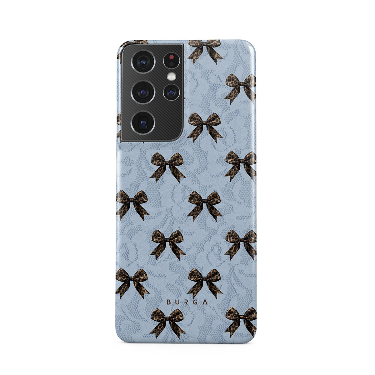For those who command attention with subtle elegance, our Fashionista Samsung Galaxy S21 Ultra phone case design is your go-to. A soft blue background, accented by dark grey bows and subtle lace patterns, exudes polished, effortless style. It's quiet confidence with a hint of charm.