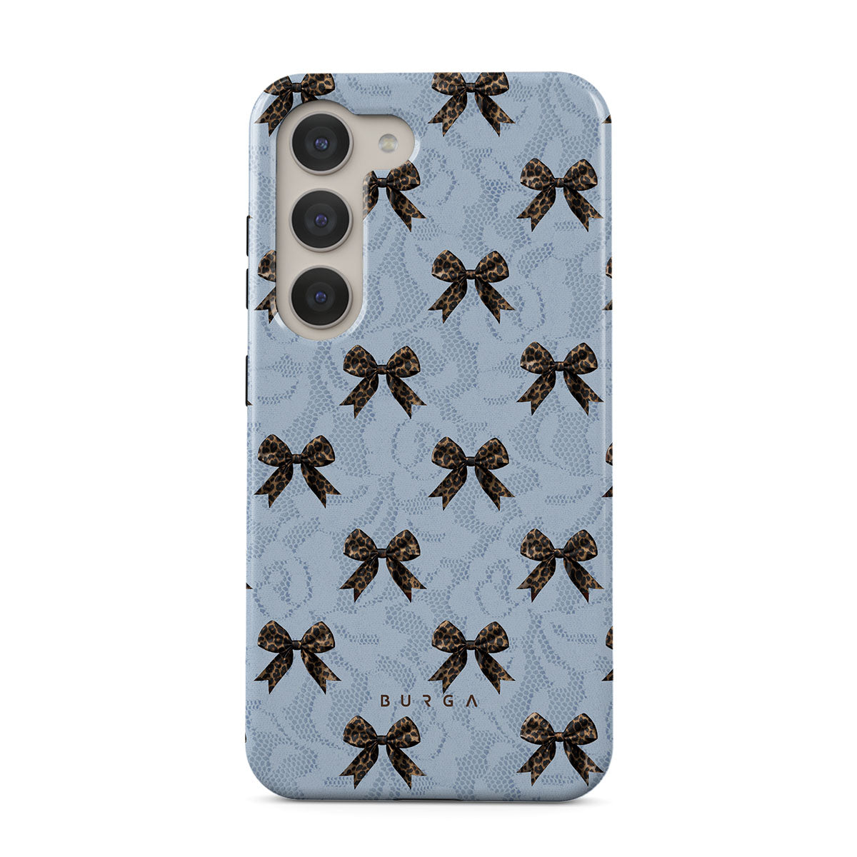 For those who command attention with subtle elegance, our Fashionista Samsung Galaxy S23 phone case design is your go-to. A soft blue background, accented by dark grey bows and subtle lace patterns, exudes polished, effortless style. It's quiet confidence with a hint of charm.