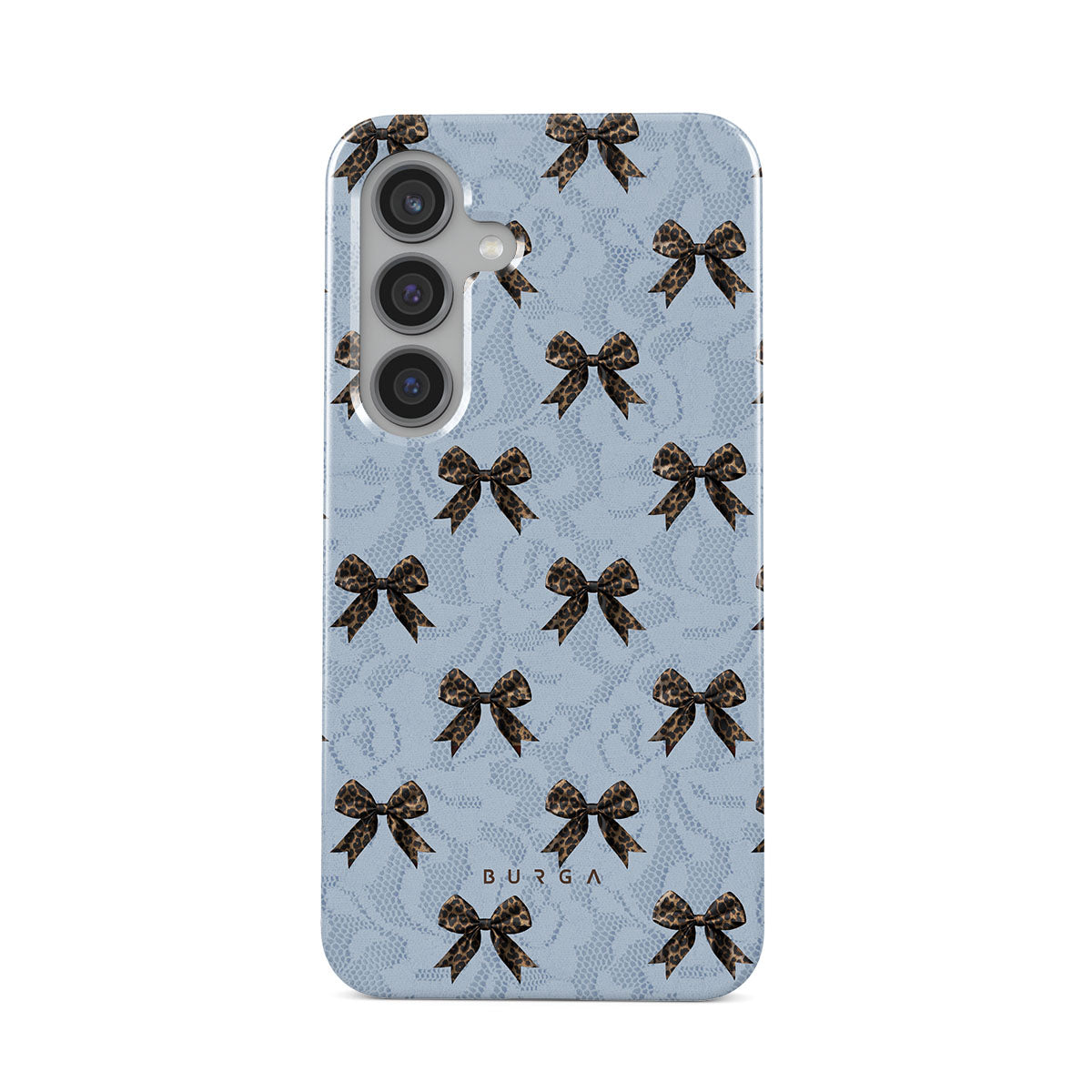 For those who command attention with subtle elegance, our Fashionista Samsung Galaxy S24 FE phone case design is your go-to. A soft blue background, accented by dark grey bows and subtle lace patterns, exudes polished, effortless style. It's quiet confidence with a hint of charm.