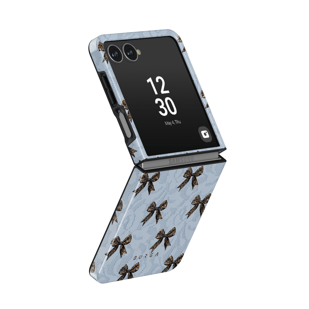 For those who command attention with subtle elegance, our Fashionista Samsung Galaxy Z Flip 7 phone case design is your go-to. A soft blue background, accented by dark grey bows and subtle lace patterns, exudes polished, effortless style. It's quiet confidence with a hint of charm.