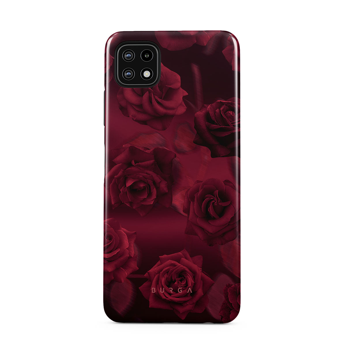 Dive into our intriguing Femme Fatale Samsung Galaxy A22 5G phone case design. These deep red roses aren't just flowers—they're silent confessions of candlelit romance and moments caught in stolen glances. Crafted for those who captivate at every turn.