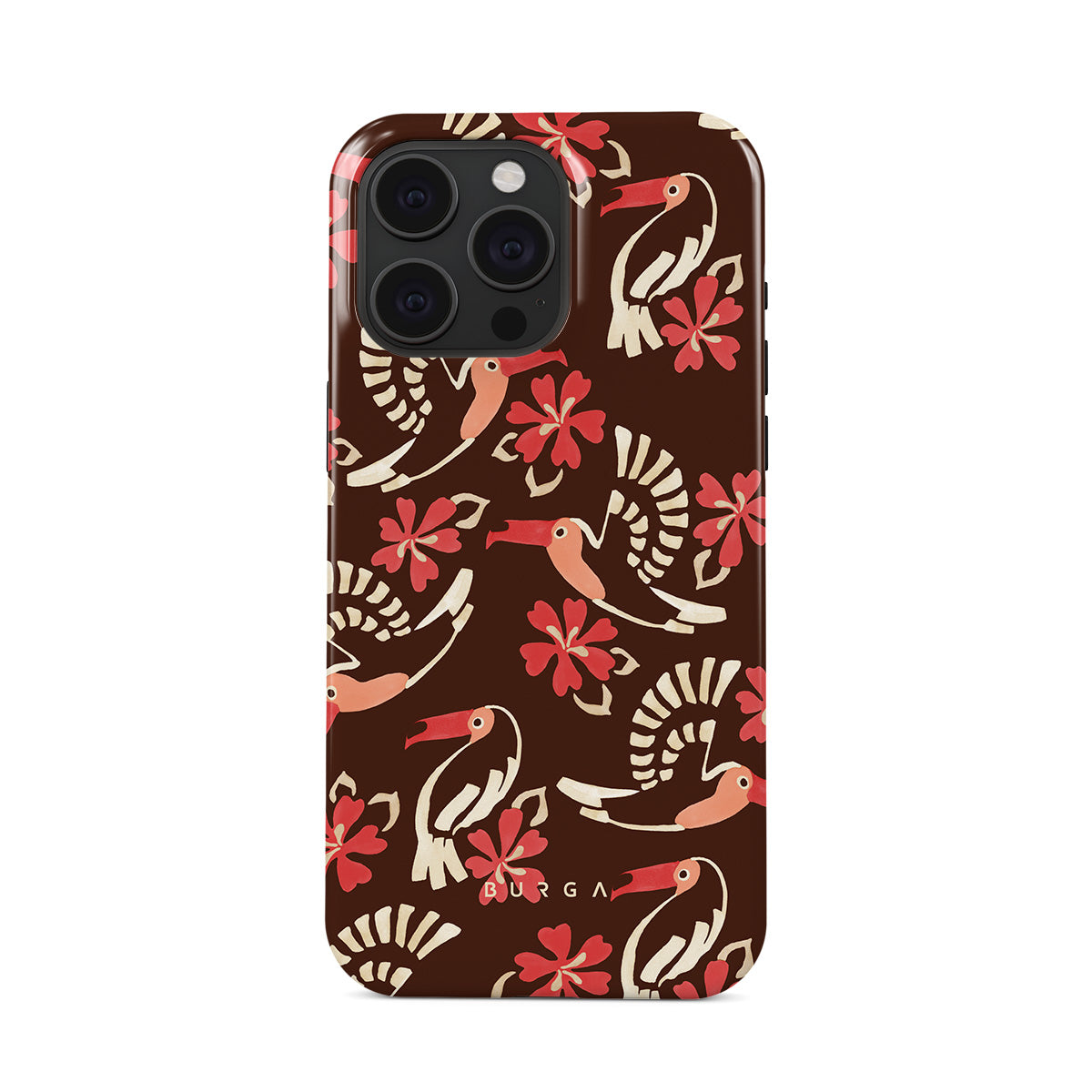 A jungle rave. Parrots, florals, bursts of red and cream—like someone threw a party in the rainforest and forgot to send you the invite. This iPhone 15 Pro phone case design is your RSVP.