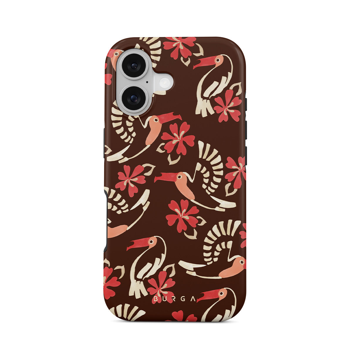 A jungle rave. Parrots, florals, bursts of red and cream—like someone threw a party in the rainforest and forgot to send you the invite. This iPhone 17 phone case design is your RSVP.