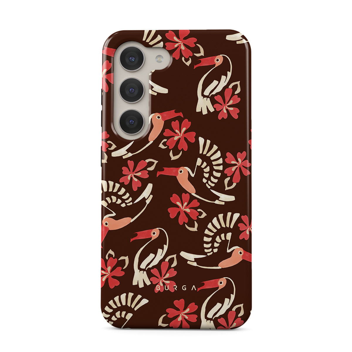 A jungle rave. Parrots, florals, bursts of red and cream—like someone threw a party in the rainforest and forgot to send you the invite. This Samsung Galaxy S23 Plus phone case design is your RSVP.