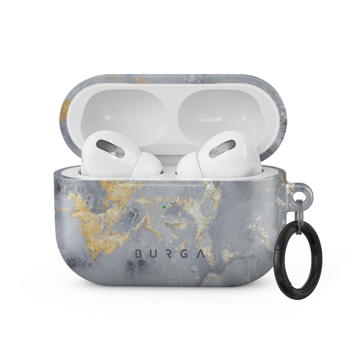 The soft gray color scheme with the golden specks creates an Apple Airpods Pro case cover that radiates sophistication. The unique design is inspired by nature and frost. Now you can keep the cool touch of winter in a design that will look good at any time of the year. Our case fits perfectly snug around Apple Airpods Pro . “Like a glove!” one might say. And it won’t disrupt the wireless charging capabilities of the newer model. There’s even an LED light indicator to prove it (don’t worry, wired charging still works, too). When fitted, the BURGA case will protect the delicate Apple Airpods Pro case beneath it from scratches, bumps, and drops while remaining scratch-free itself. Our signature design pattern prints are High Quality, and will never peel or fade away- thanks to our unique printing technology. And finally, a handy carabiner is there to make your life easier and more convenient: just snap it around your keys or belt loop and tackle the day head-on. Your music is right there by your side when you need it.