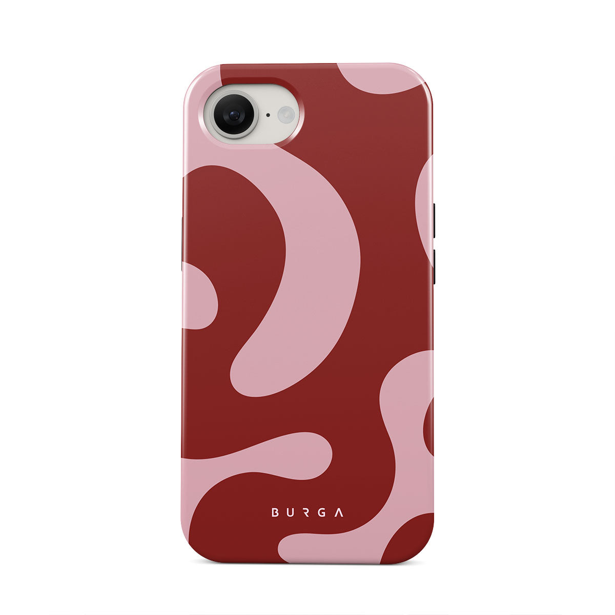 This design features: waves, abstract pattern, dark red swirls, pink swirls.