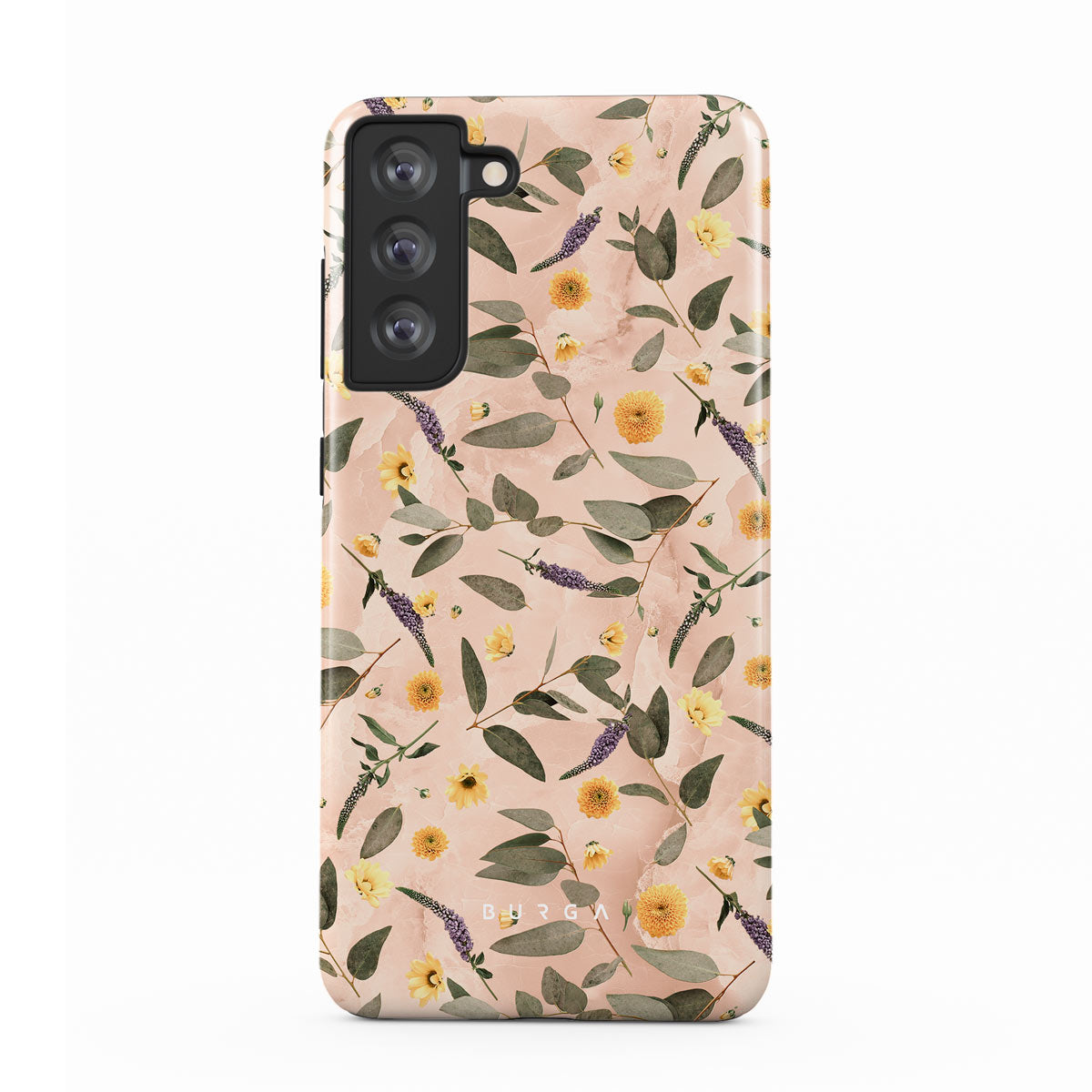 Sunday Brunch Samsung Galaxy S21 FE phone case features a timeless flower pattern. The soft-toned case with a pop of lavender and yellow colors will add a splash of energy to your style while protecting your phone from dangerous falls.