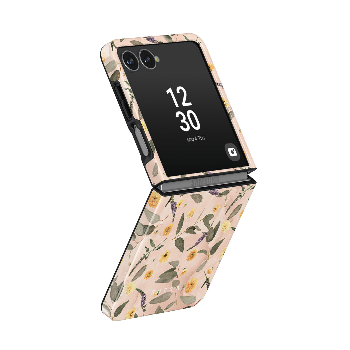 Sunday Brunch Samsung Galaxy Z Flip 7 phone case features a timeless flower pattern. The soft-toned case with a pop of lavender and yellow colors will add a splash of energy to your style while protecting your phone from dangerous falls.