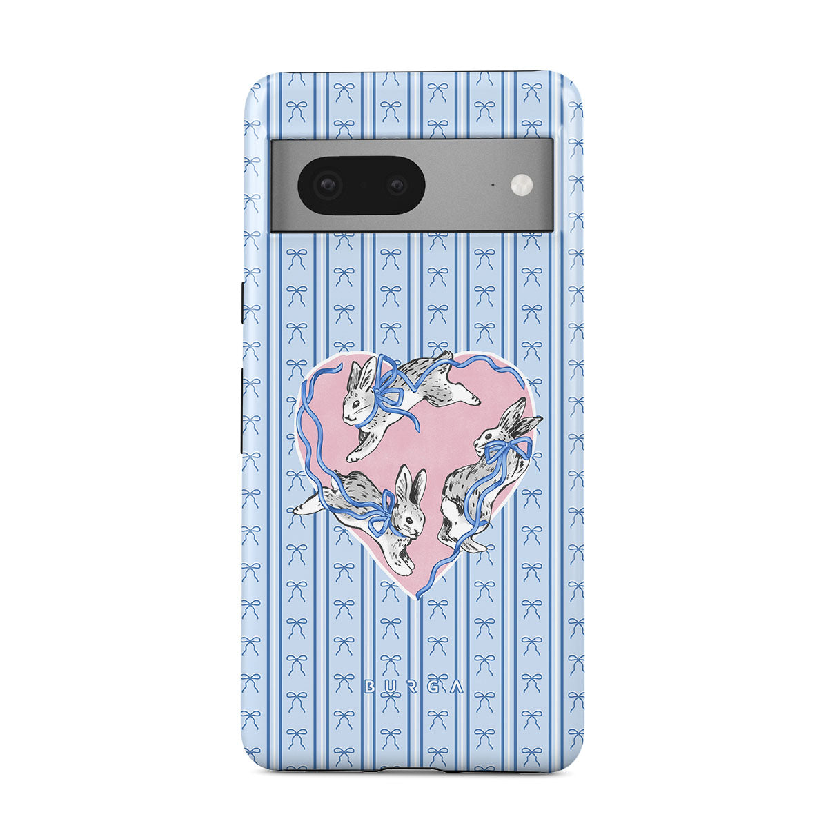This design features: white rabbits, heart frame, blue stripes