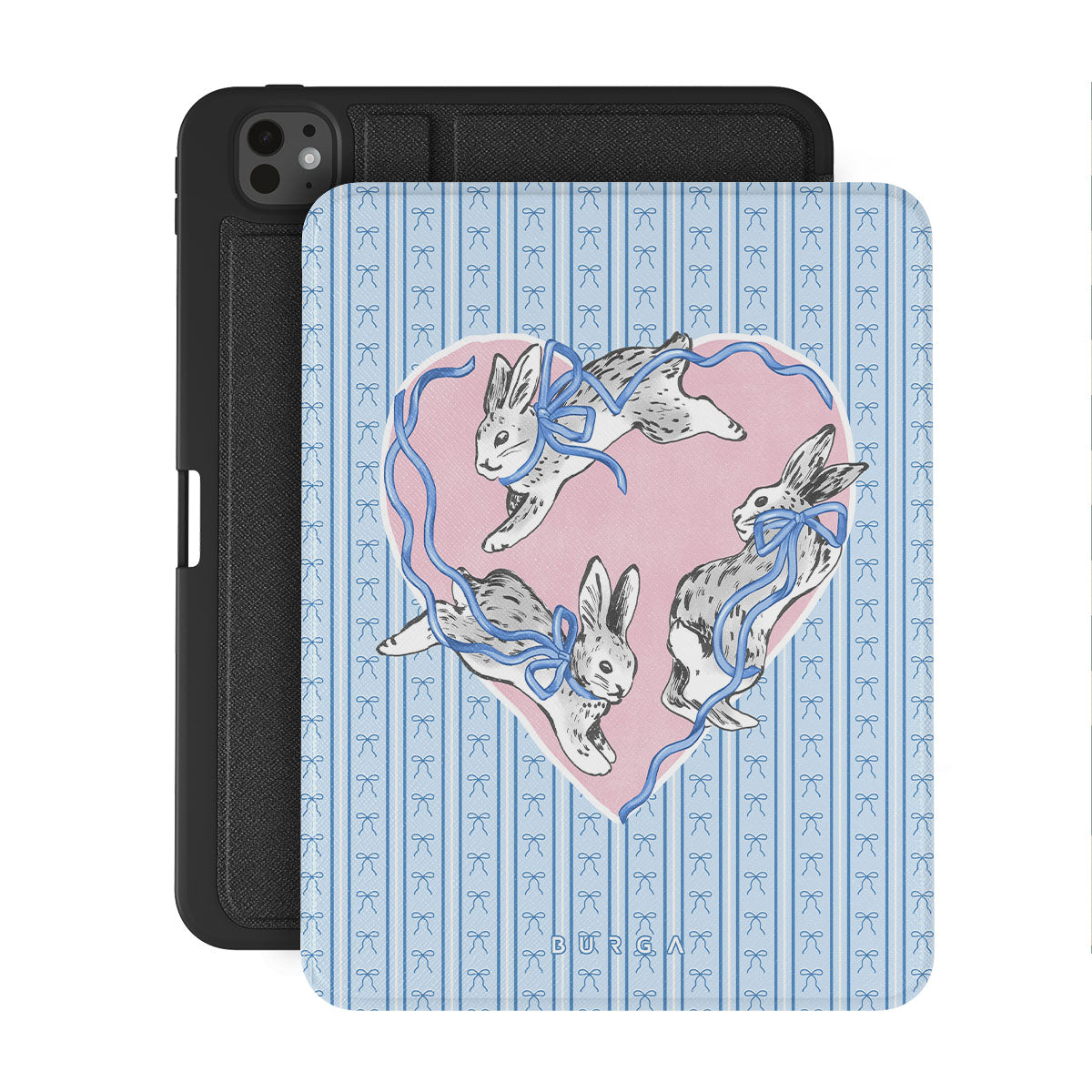 They run, you chase. Or maybe you run, and they chase you. The Follow Me folio case design is an eternal loop—white rabbits tangled in pink ribbons, leading you somewhere unknown. Or maybe, somewhere you’ve already been.