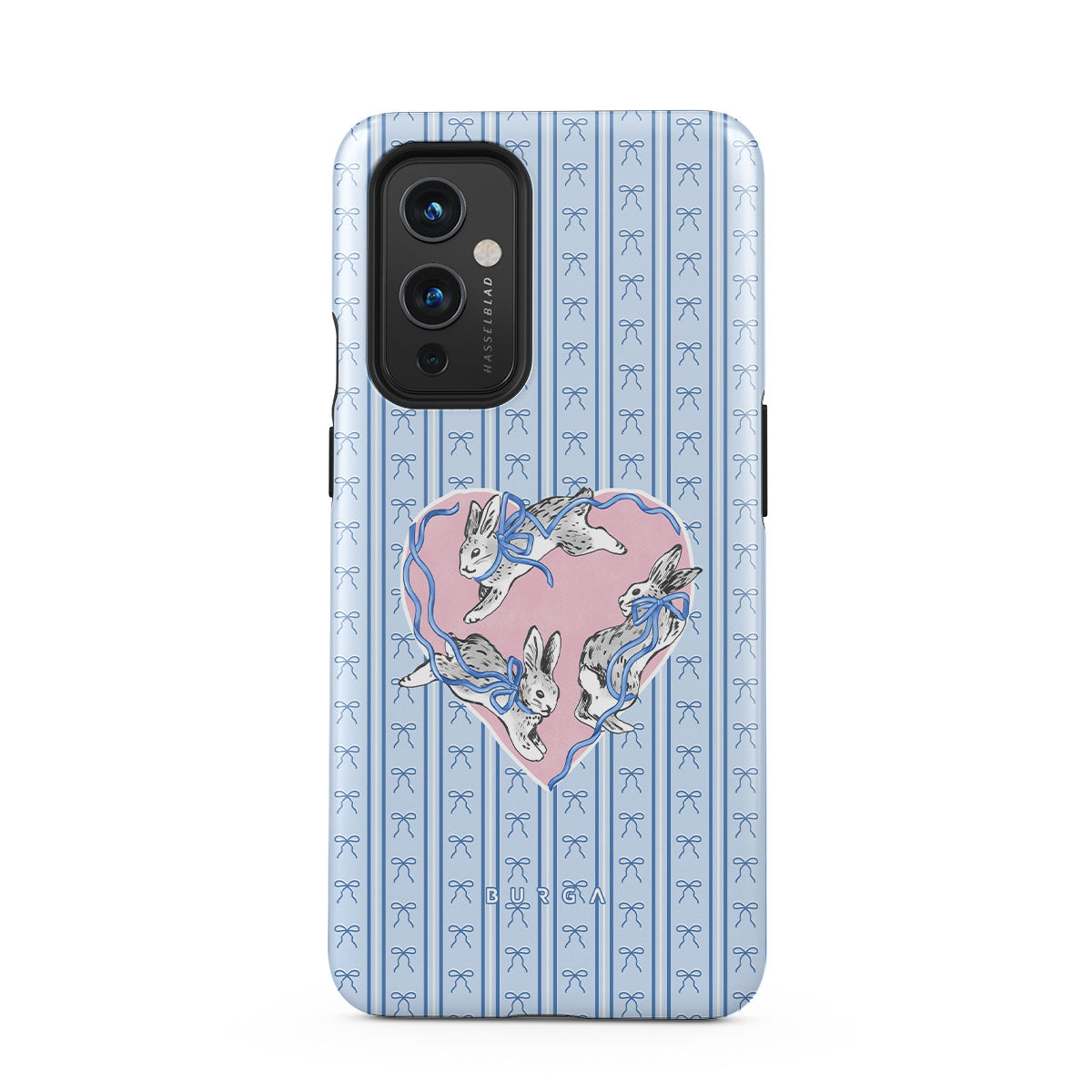 This design features: white rabbits, heart frame, blue stripes