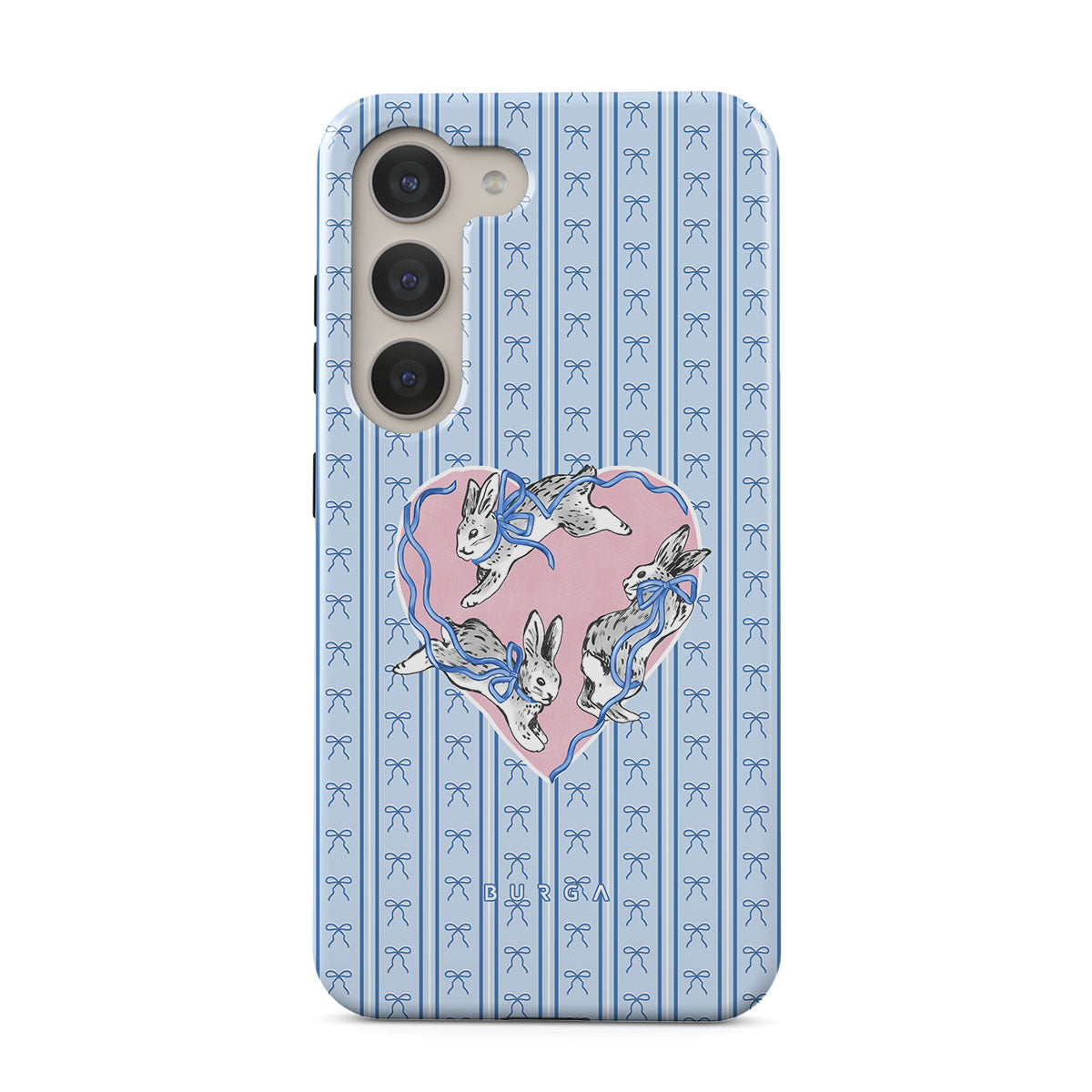They run, you chase. Or maybe you run, and they chase you. The Follow Me Samsung Galaxy S23 Plus phone case design is an eternal loop—white rabbits tangled in pink ribbons, leading you somewhere unknown. Or maybe, somewhere you’ve already been.