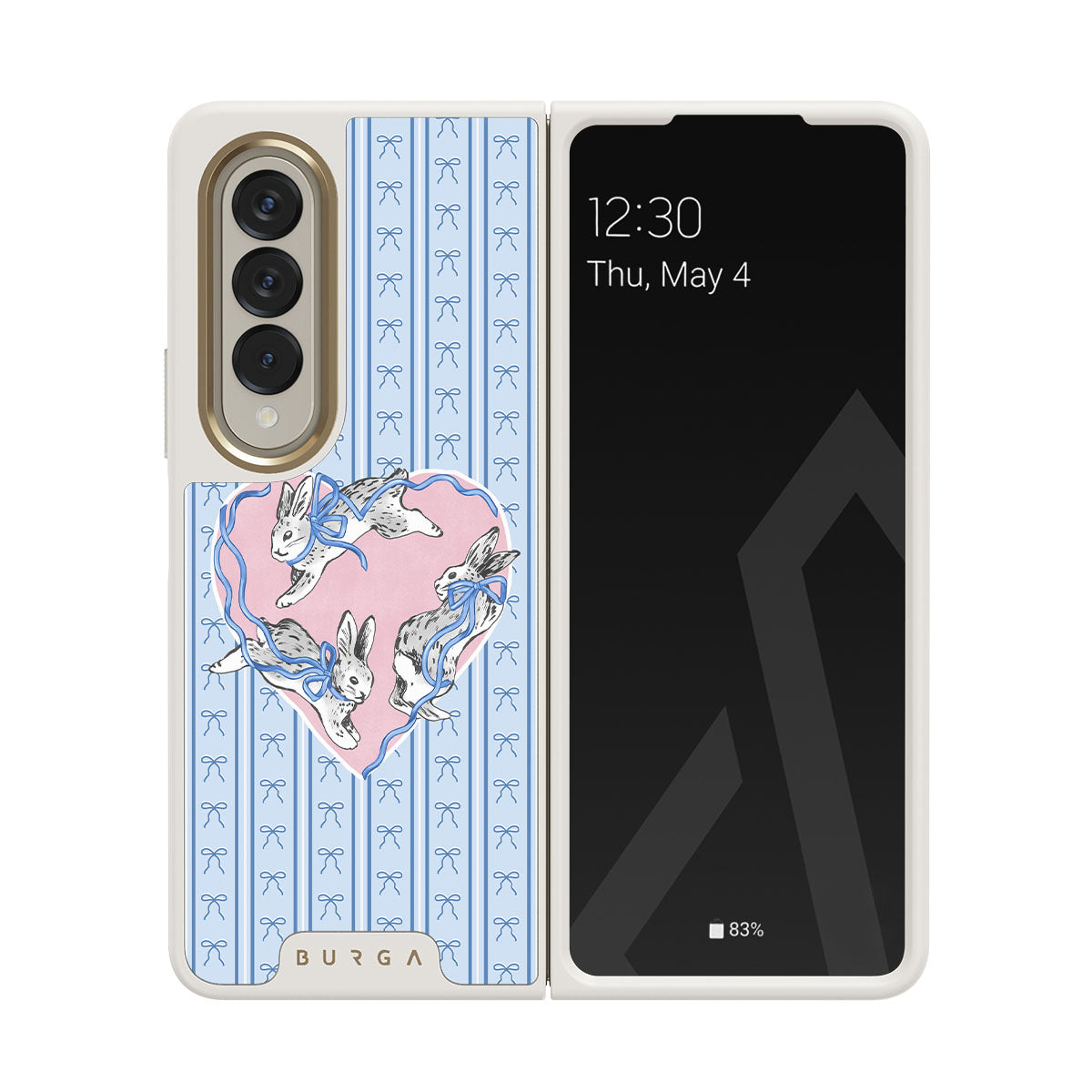 They run, you chase. Or maybe you run, and they chase you. The Follow Me Samsung Galaxy Z Fold 4 phone case design is an eternal loop—white rabbits tangled in pink ribbons, leading you somewhere unknown. Or maybe, somewhere you’ve already been.