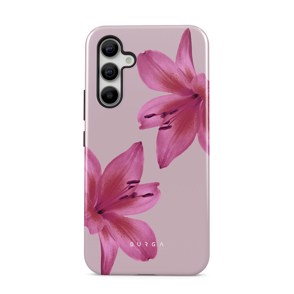 A gentle hush of pink forms where soft lilies sway. Their tender petals — a silent ode to the delicate dance of life. The Fragile Beauty Samsung Galaxy A55 phone case design invites you to lean into the soft embrace of nature, letting its subtle rhythms guide your journey.