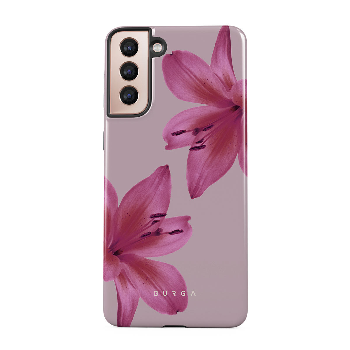 A gentle hush of pink forms where soft lilies sway. Their tender petals — a silent ode to the delicate dance of life. The Fragile Beauty Samsung Galaxy S21 Plus phone case design invites you to lean into the soft embrace of nature, letting its subtle rhythms guide your journey.