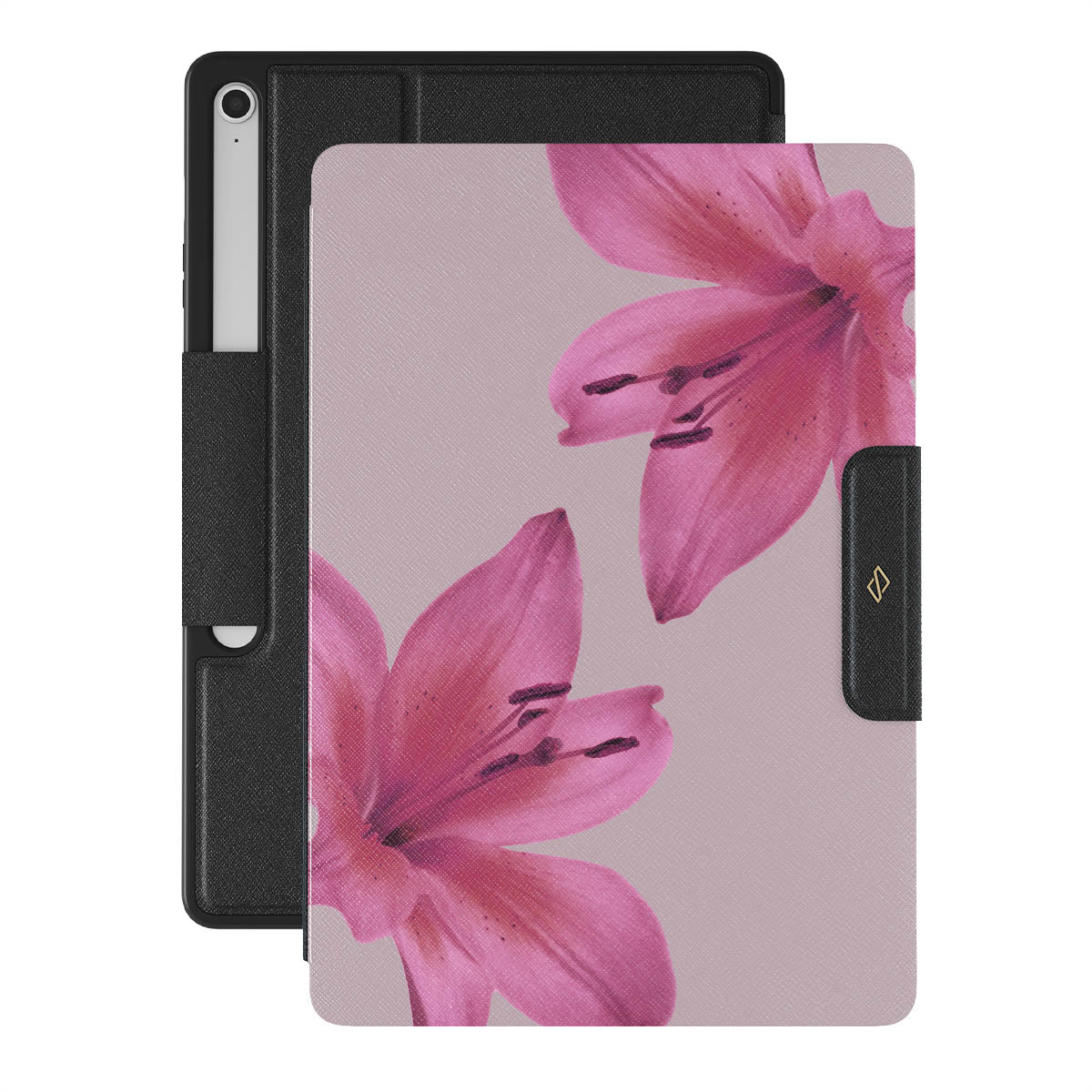 A gentle hush of pink forms where soft lilies sway. Their tender petals — a silent ode to the delicate dance of life. The Fragile Beauty Samsung Galaxy Tab S10+ FE folio case design invites you to lean into the soft embrace of nature, letting its subtle rhythms guide your journey.