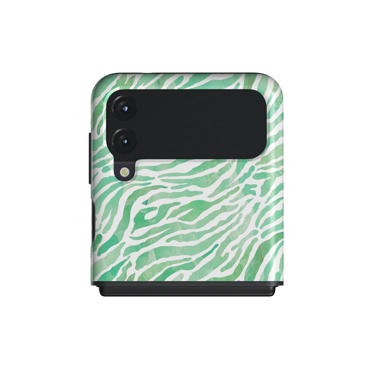 Our Free Spirit Samsung Galaxy Z Flip 3 phone case features an exotic zebra pattern in varying shades of green. Keep your spirits up, as there is no need to worry about your phone, as this trendy case is not only pretty but offers the heavy-duty protection that your cellphone requires.