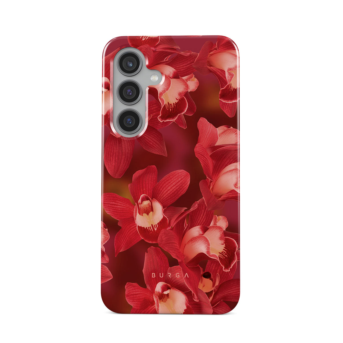 The deep red orchids emerge with a passionate intensity, evoking the fervor and depth of emotions that come with fully experiencing life. They are a vibrant call to embrace every heartbeat, to live deeply and love boldly. Discover the Goddess Energy Samsung Galaxy S24 Plus phone case design.