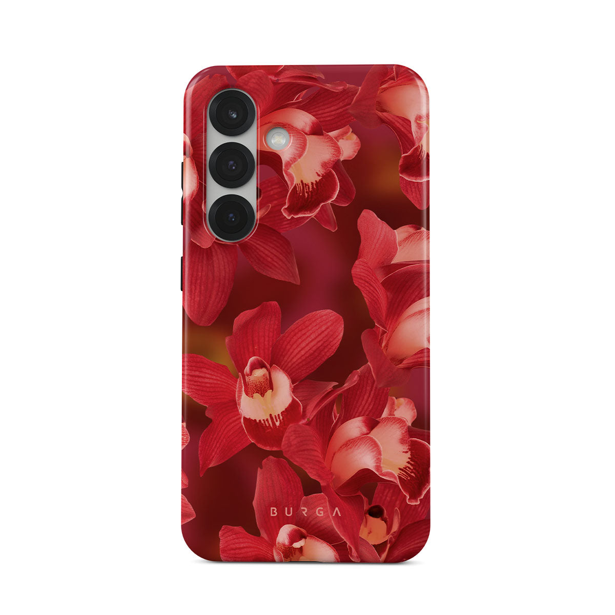 The deep red orchids emerge with a passionate intensity, evoking the fervor and depth of emotions that come with fully experiencing life. They are a vibrant call to embrace every heartbeat, to live deeply and love boldly. Discover the Goddess Energy Samsung Galaxy S25 Plus phone case design.