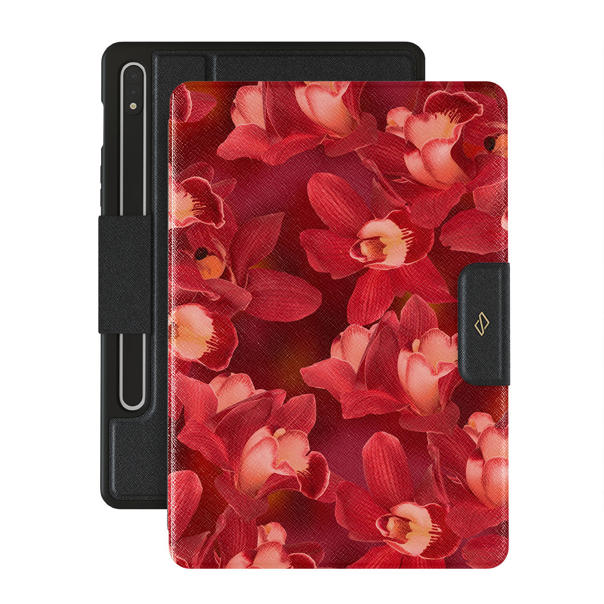 The deep red orchids emerge with a passionate intensity, evoking the fervor and depth of emotions that come with fully experiencing life. They are a vibrant call to embrace every heartbeat, to live deeply and love boldly. Discover the Goddess Energy Samsung Galaxy Tab S9 folio case design.