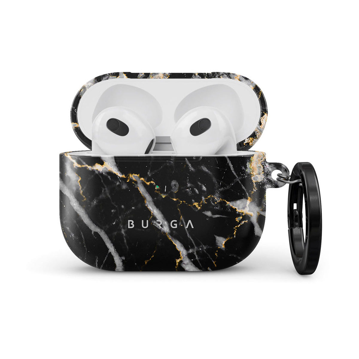 Apple Airpods 3 case cover displays a classical black and white marble enriched with gold specks. Such introduction of golden marble details radiates elegance and is a fantastic addition to every wardrobe. Our case fits perfectly snug around Apple Airpods 3 . “Like a glove!” one might say. And it won’t disrupt the wireless charging capabilities of the newer model. There’s even an LED light indicator to prove it (don’t worry, wired charging still works, too). When fitted, the BURGA case will protect the delicate Apple Airpods 3 case beneath it from scratches, bumps, and drops while remaining scratch-free itself. Our signature design pattern prints are High Quality, and will never peel or fade away- thanks to our unique printing technology. And finally, a handy carabiner is there to make your life easier and more convenient: just snap it around your keys or belt loop and tackle the day head-on. Your music is right there by your side when you need it.