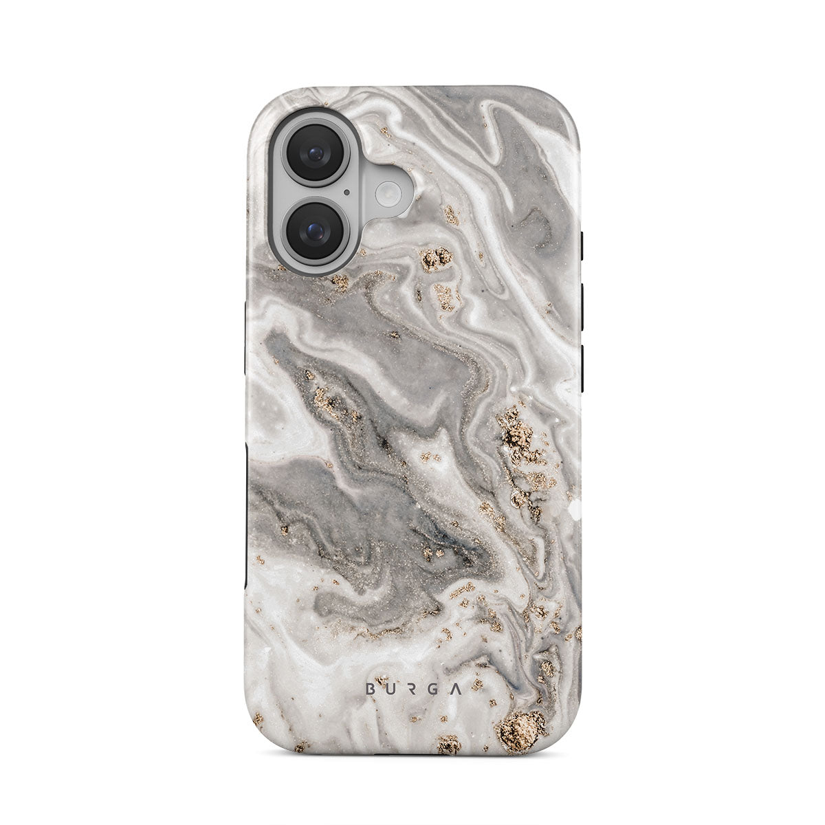 The wind outside is playing his songs. Some fear, some love, and some simply enjoy. But do not be afraid, with our grey marble iPhone 16 phone case inspired by a beautiful snowstorm, you can have the pretty part of it without any coldness. And as the case offers heavy-duty protection, your phone will also be safe and sound!