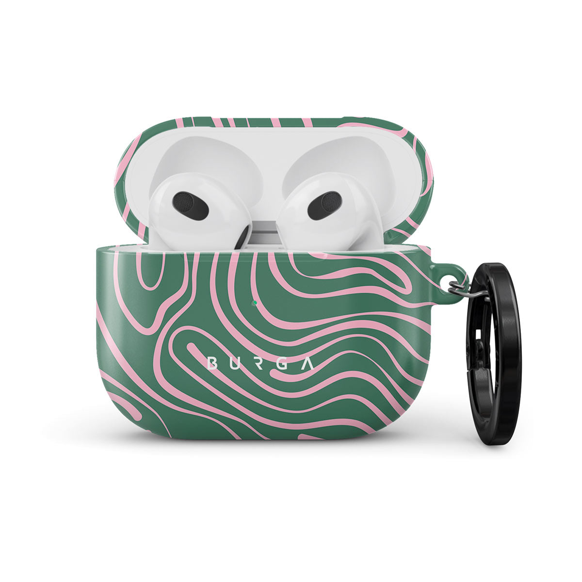 Fresh and mesmerizing, our Hawaiian Breeze Apple Airpods 3 case cover design combines a pastel pink wavy pattern with a crisp green background creating a refreshing look. The abstract pattern will indeed become a star in your accessorizing game, while the airpod case will keep your device protected at all times!