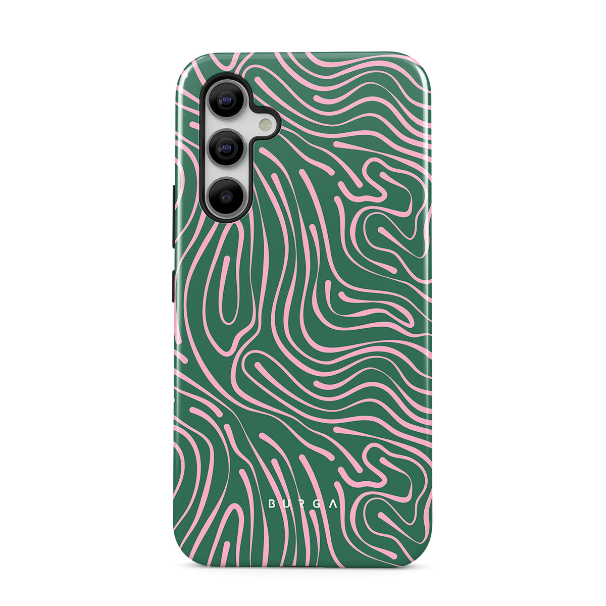 Fresh and mesmerizing, our Hawaiian Breeze Samsung Galaxy A55 phone case design combines a pastel pink wavy pattern with a crisp green background creating a refreshing look. The abstract pattern will indeed become a star in your accessorizing game, while the phone case will keep your device protected at all times!