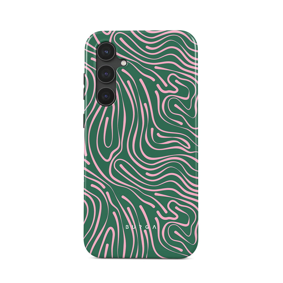Fresh and mesmerizing, our Hawaiian Breeze Samsung Galaxy S23 FE phone case design combines a pastel pink wavy pattern with a crisp green background creating a refreshing look. The abstract pattern will indeed become a star in your accessorizing game, while the phone case will keep your device protected at all times!