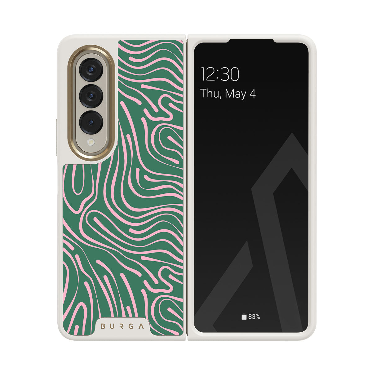 Fresh and mesmerizing, our Hawaiian Breeze Samsung Galaxy Z Fold 4 phone case design combines a pastel pink wavy pattern with a crisp green background creating a refreshing look. The abstract pattern will indeed become a star in your accessorizing game, while the phone case will keep your device protected at all times!