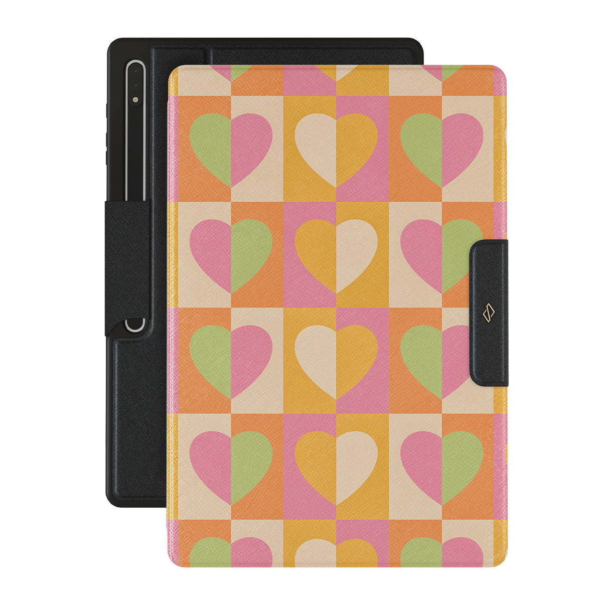 Beautifully geometrical and lovable Summer Love {Galaxy Tab Model} Samsung Galaxy Tab S9 Ultra folio case combines a soft pastel color scheme with a playful square heart pattern. Adding a touch of love to your style was never easier! Keep your Galaxy Tab as safe as you keep your heart in a cheeky checkered protective Galaxy Tab case!