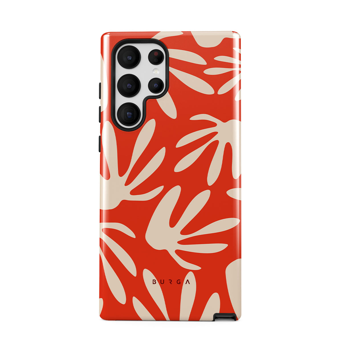 Unfolding the untamed allure of a summer sunset, this design boasts a vivid red background that sets your spirit of adventure aflame. Sprinkled across this fierce backdrop, lines of radiance dance playfully. Experience the warmth of passion and the sparkle of joy in the palm of your hand with our Heatwave Samsung Galaxy S22 Ultra phone case.