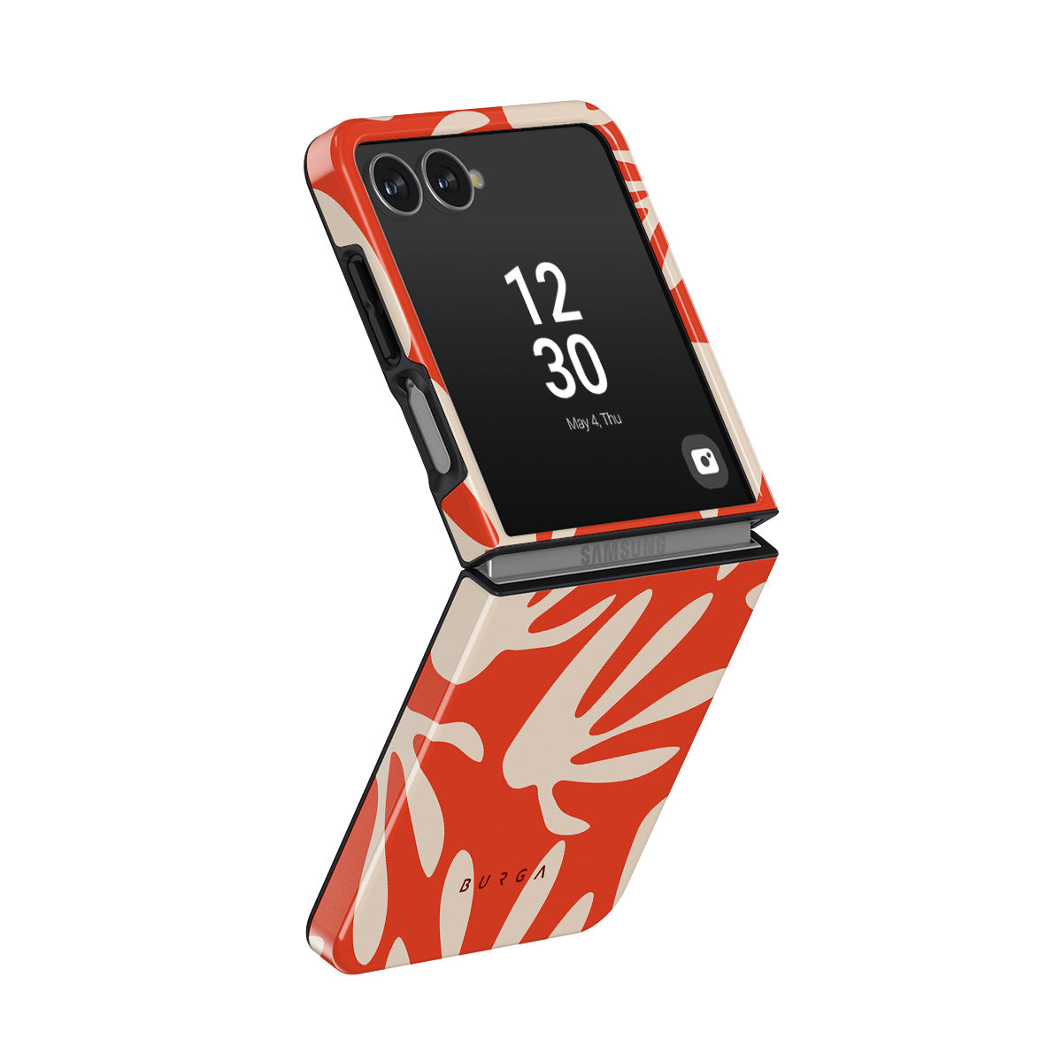 Unfolding the untamed allure of a summer sunset, this design boasts a vivid red background that sets your spirit of adventure aflame. Sprinkled across this fierce backdrop, lines of radiance dance playfully. Experience the warmth of passion and the sparkle of joy in the palm of your hand with our Heatwave Samsung Galaxy Z Flip 7 phone case.