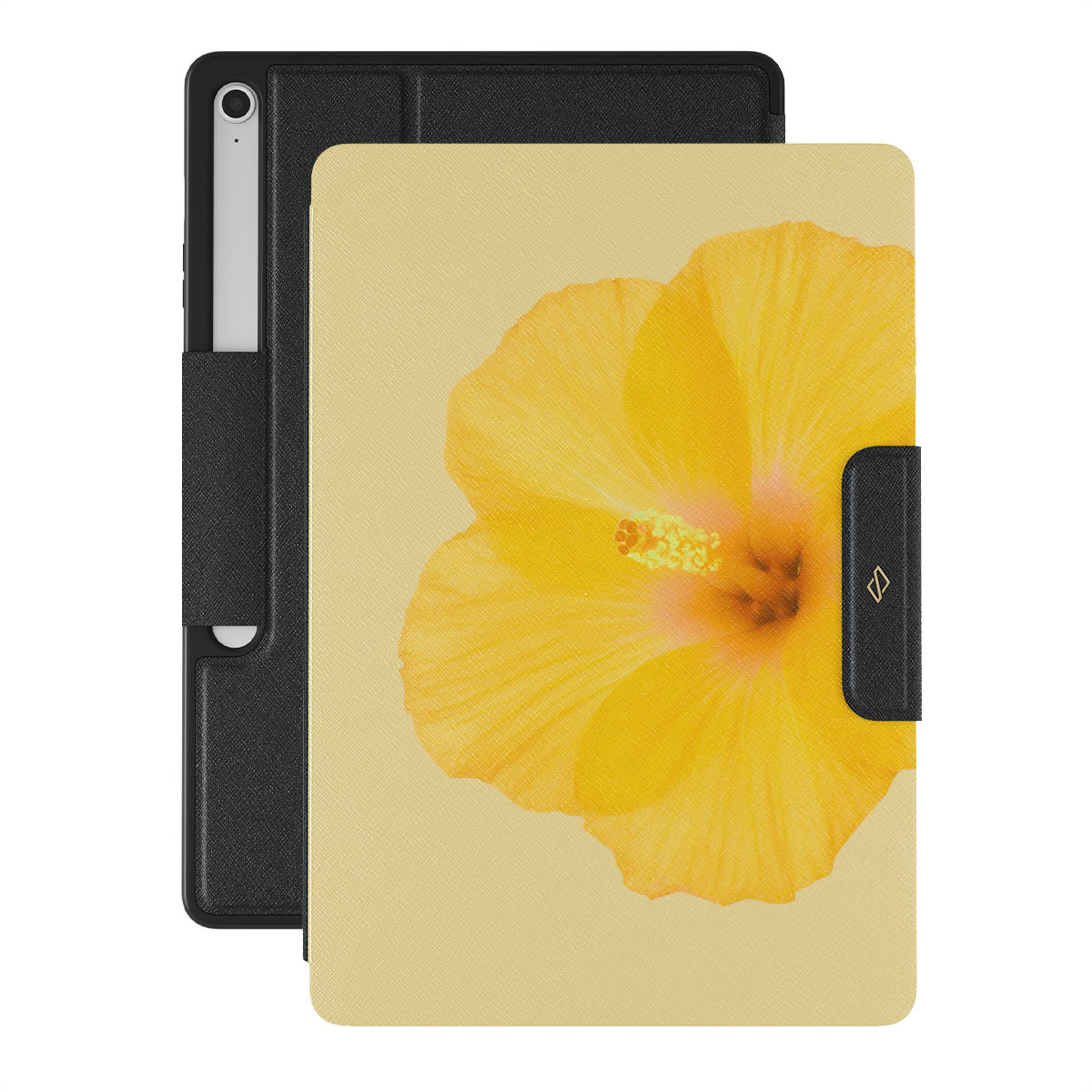 Our Hibiscus Samsung Galaxy Tab S10+ FE folio case features a striking design with a large, vibrant yellow hibiscus flower on a matching yellow background. This tropical flower pattern exudes a sense of warmth and exotic beauty, perfect for those who love nature-inspired and floral aesthetics.