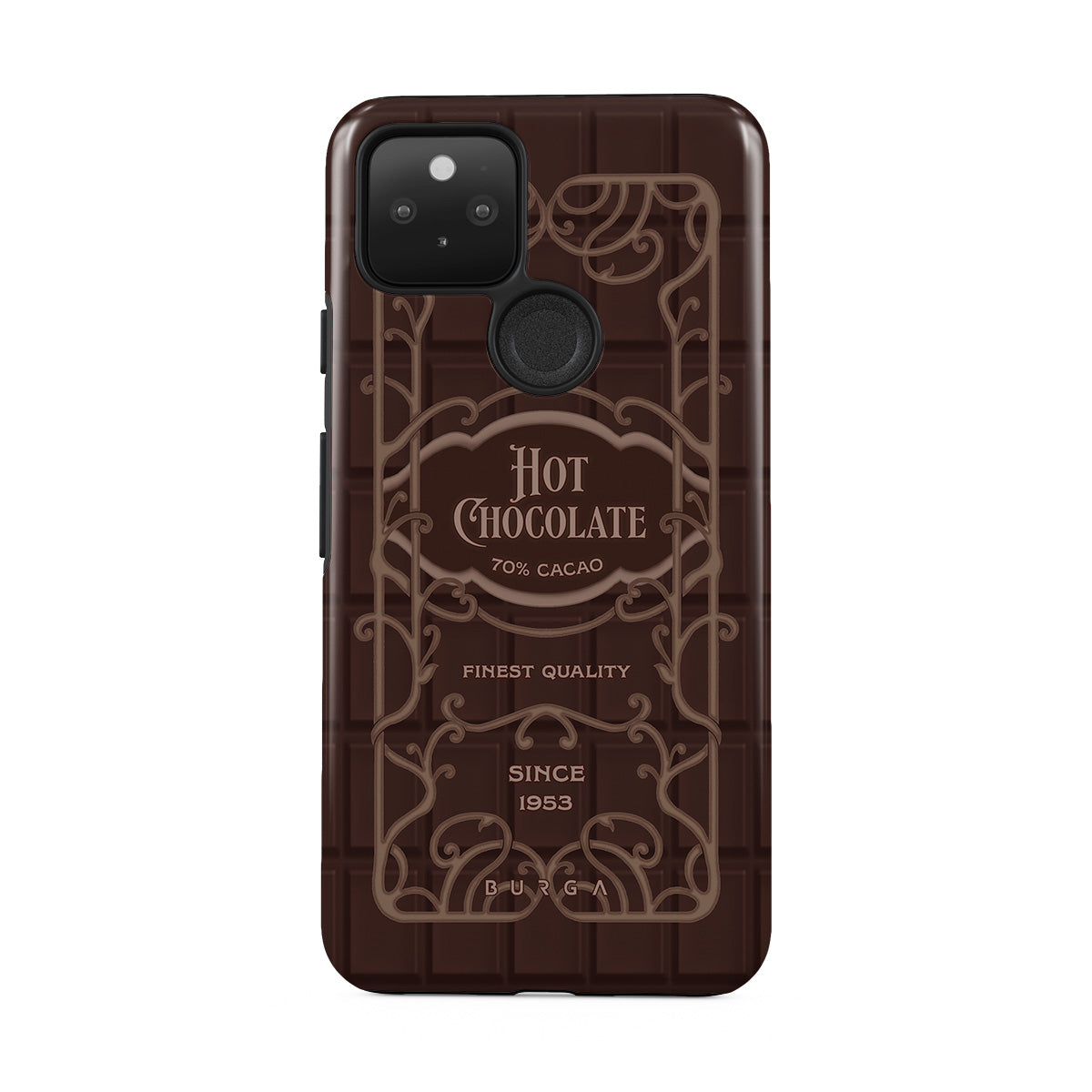 This design features: hot chocolate label, brown chocolate design, retro packaging style