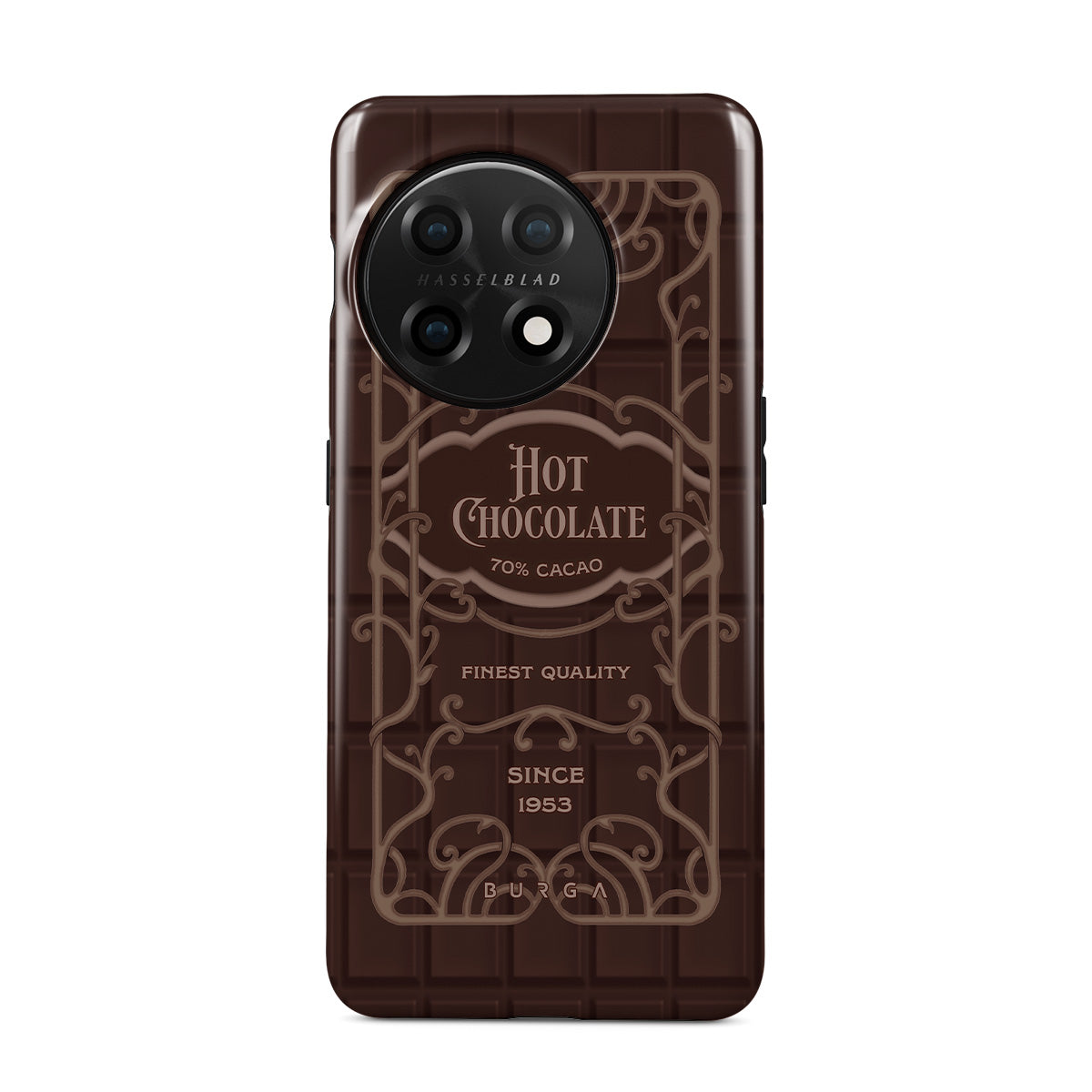 This design features: hot chocolate label, brown chocolate design, retro packaging style