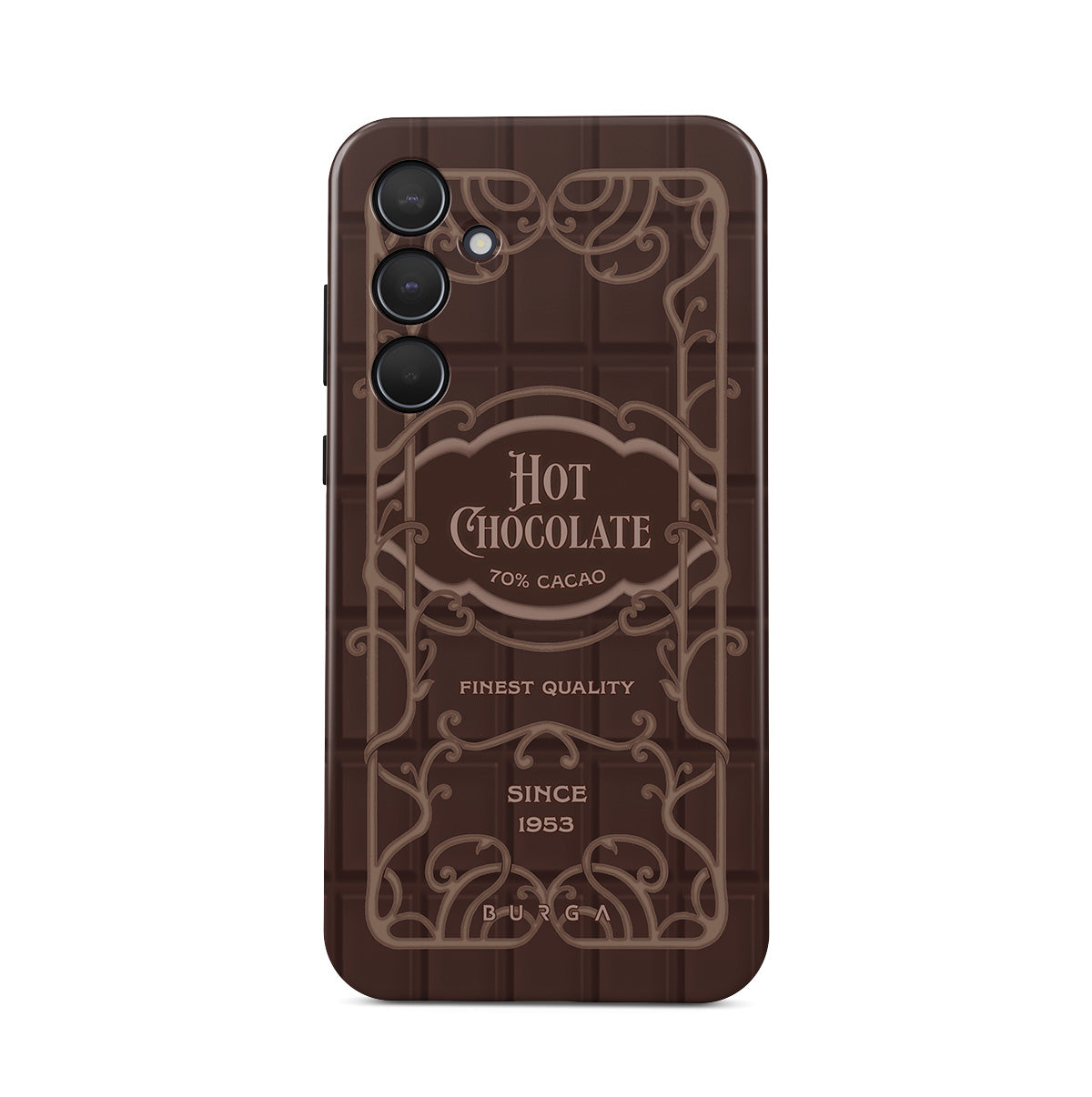 This design features: hot chocolate label, brown chocolate design, retro packaging style