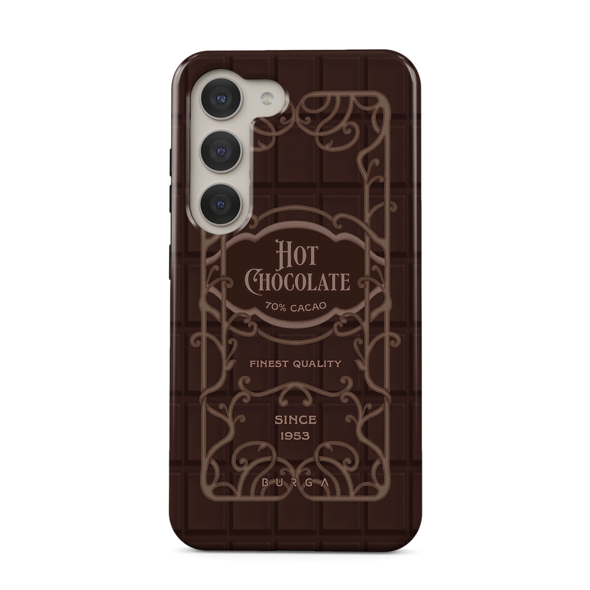 This design features: hot chocolate label, brown chocolate design, retro packaging style