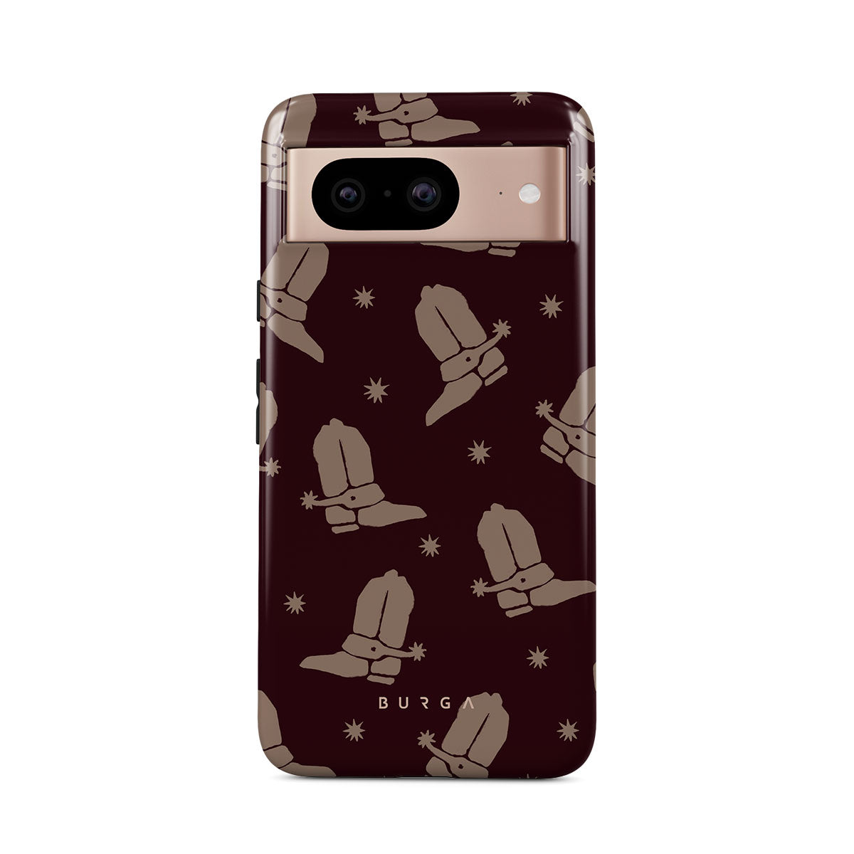 Say Howdy to this charming Google Pixel 8 phone case design. Cowboy boots and stars dance across a deep brown background, celebrating the essence of western life. Perfect for those who embrace their free spirit.